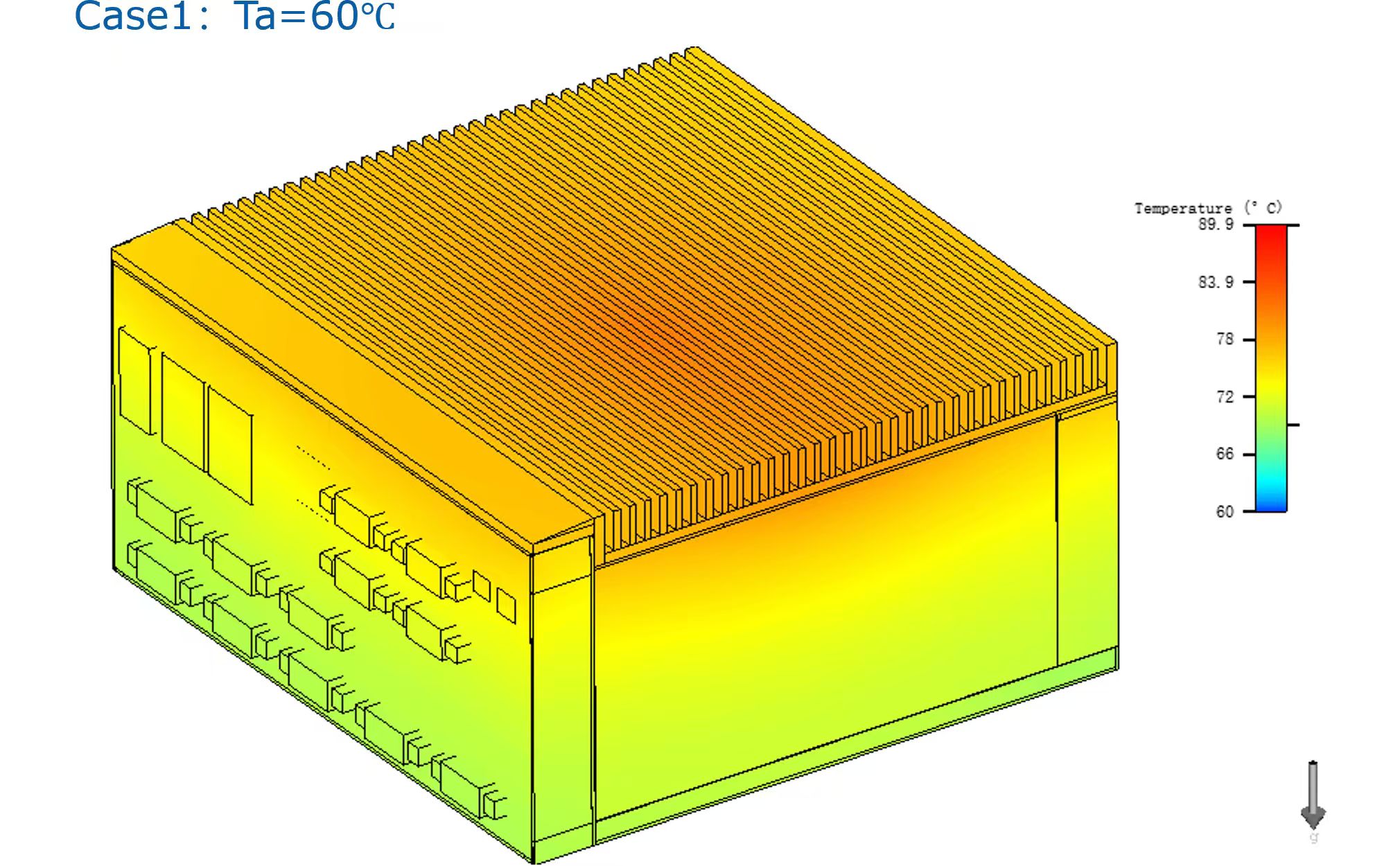 - 这是设备散热鳍片的俯视图,颜色代表温度高低(红色最高,蓝色最低)。