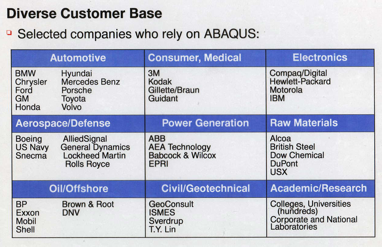 Abaqus软件已被全球工业界广泛接受,并拥有世界最大的非线性力学用户群。Abaqus软件以其强大的非线性分析功能以及解决复杂和深入的科学问题的能力,在结构工程领域得到广泛认可,除普通工业用户外,也在以高等院校、科研院所等为代表的高端用户中得到广泛称誉。研究水平的提高引发了用户对高水平分析工具需求的加强,作为满足这种高端需求的有力工具,Abaqus软件在各行业用户群中所占据的地位也越来越突出。Abaqus软件的用户绝大部分是租赁用户,这些用户通常对产品和服务要求都是很苛刻的。Abaqus是一个推崇技术的公司,它始终走在结构力学研究和软件化领域的前沿,它良好的品质和服务得到业界的广泛认可,这也是占其用户很大比重的租赁用户一年又一年往复租用它的原因。