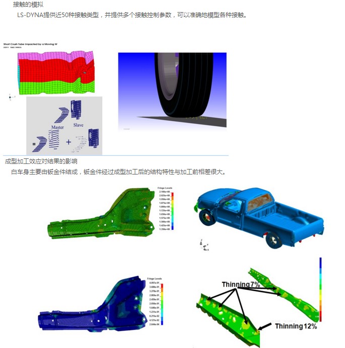 变形体-刚性体间、自身接触等接触类型,接触可以是考虑各种摩擦模型、粘连和分离等。具有丰富的单元库和非线性材料模型,分析类型可以是静力非线性、非线性屈曲和模态、动力非线性和蠕变分析及多种非线性的组