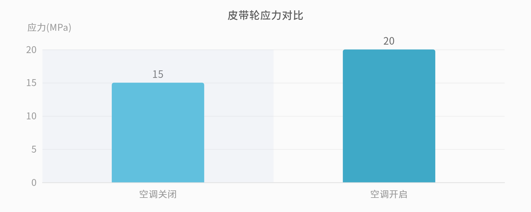 通过对比空调开启(3.8kW负载)与关闭工况发现:皮带轮最大应力从15MPa增至20MPa,但仍在安全范围内。关键差异体现在皮带轮1的受力变化(940N vs 800N),验证了空调负载对传动系统的边际影响。
