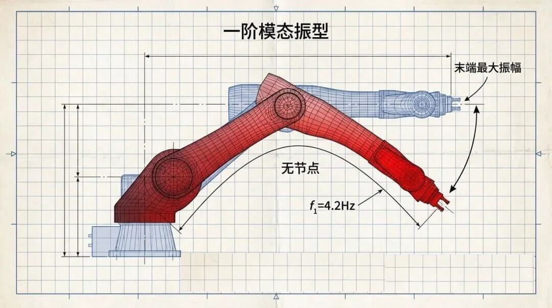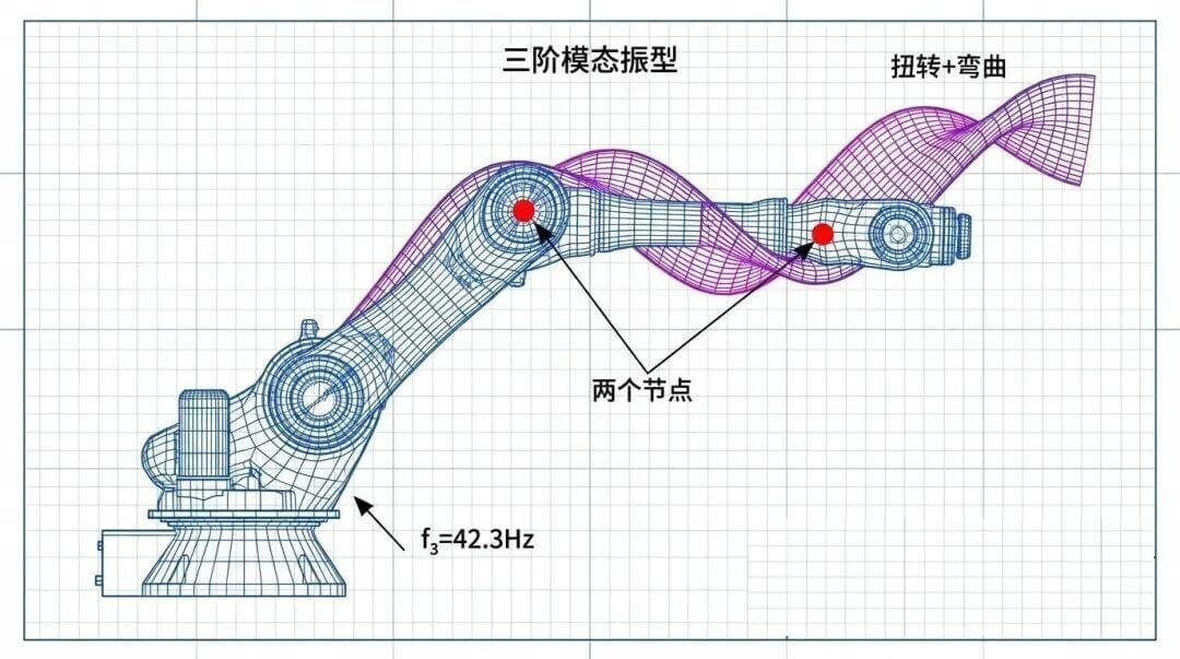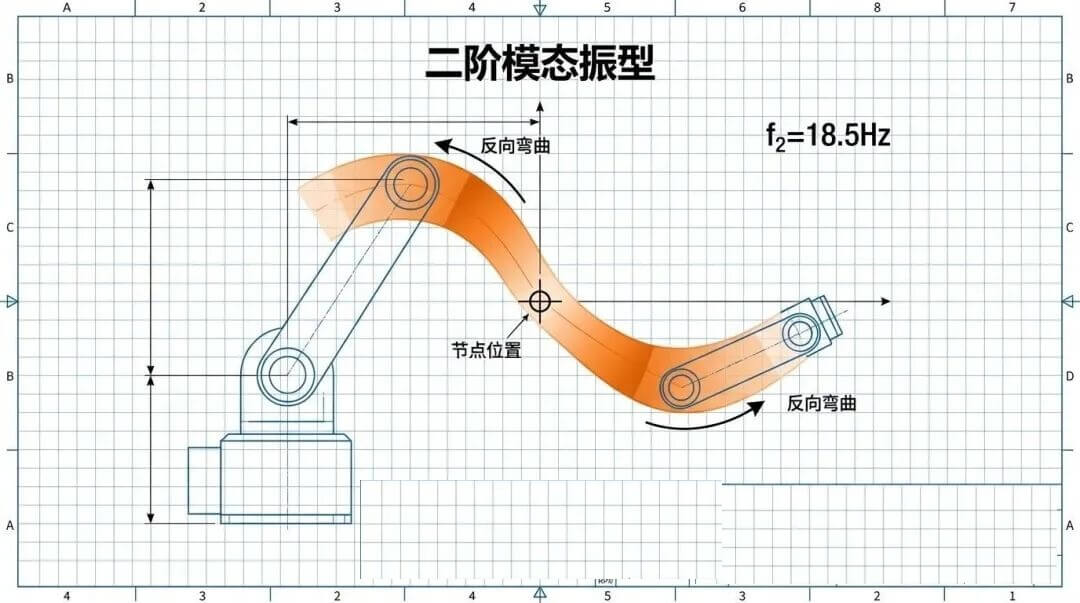 前臂和后臂反向弯曲,呈现S型变形。工程案例显示,某SCARA机械臂的二阶频率为18.5Hz,振型分析发现节点位置位于第二关节附近,最大变形发生在前臂中段。