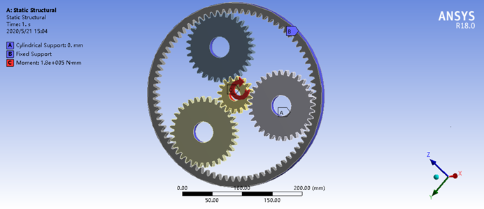 模型导入ANSYS Workbench软件后,系统将自动为行星轮系传动装配模型增加接触关系,对一般的静力学接触问题分析,只需确定其他约束关系和载荷,即可进行静态求解。在三个行星齿轮轴颈、太阳轮轴颈处施加圆柱面约束以模拟轴承支承,切线方向设定为“自由”,在齿圈的外圈添加固定约束。根据行星轮系工作要求,在太阳轮(动力输入轴)轴颈处加载转矩1.8×105 N·mm,加载后的有限元模型如图3所示。在静力学分析设置选项中,设置“Large Deflection”为“ on ”,激活大变形,然后进行求解。