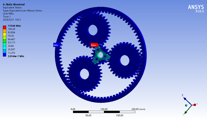 通过对行星轮系传动有限元模型的求解,得到总体等效应力云图,如图4所示。从图中可以看出:在给定工况下,等效应力主要分布在太阳轮与三个行星齿轮啮合处,最大等效应力发生在太阳轮的齿根圆角处,最大值为119.64MPa。通过分析可得到:在预载荷条件下,行星轮系传动系统最可能的失效是太阳轮沿齿根圆角处的轮齿断裂。由于太阳轮材料的屈服极限σb=1080MPa,最大等效应力远小于材料的屈服极限,满足强度设计要求,因此太阳轮设计是安全的。