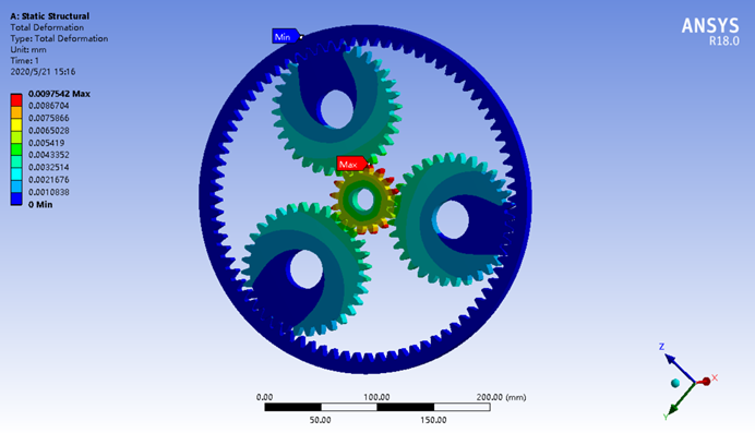 图5所示为总位移分布情况,由图5可知:太阳轮与三个行星齿轮啮合部位等效应变比较大,啮合齿轮齿根变形比周围大。最大位移发生在太阳轮齿轮顶部,其最大值为9.75×10-3 mm ,变形量相对较小,不影响行星轮系正常工作。