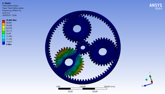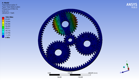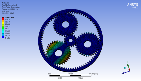 行星齿轮减速器具有体积小、结构紧凑、传动比大、效率高、轴承负荷小、可同轴传输运动和动力等优点,在很多情况下可代替定轴轮系传动机构,是机械工程领域广泛应用的传动类型。然而,齿轮传动过程中两轮齿间的啮合是线接触,啮合部位容易磨损,甚至造成齿轮轮齿折断,致使行星轮系传动失效,因此有必要对行星轮系进行静力学有限元分析,以改进行星轮系传动效率,减少齿轮传动过程中的振动和噪音,优化传动性能,提高使用寿命。同时,行星减速器在工作过程中,传动齿轮受到外部周期性载荷作用,在额定转速内有可能发生强烈的共振,动应力急剧增加,致使齿轮过早出现扭转疲劳和弯曲疲劳,最终引起轮齿折断。在行星轮系结构设计和计算中,静力学计算不能完全满足设计要求,因此有必要对行星轮系装配体进行模态分析,确定结构的振动特性,获得其固有频率、振型等参数。通过模态分析找出结构设计中的薄弱环节,避免行星轮系在外部载荷作用下产生共振,因此模态分析是行星轮系结构设计的重要内容,同时也是进行其他动力学分析前期必须完成的工作。