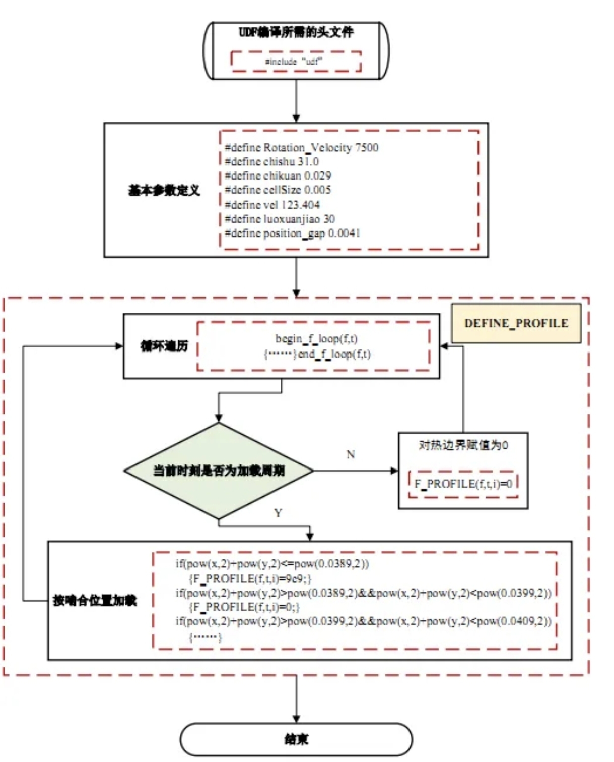 将 1.1 节中求得的单齿平均热流密度分布分别加载到齿轮沿齿高方向的各个位置。图 1.1 为加载原理图,在笛卡尔坐标系中,以齿面所在圆的半径差定义齿高方向网格划分加载区域,在 UDF 循环遍历网格时会自动求得网格位置的半径实现相应位置热流密度的施加。