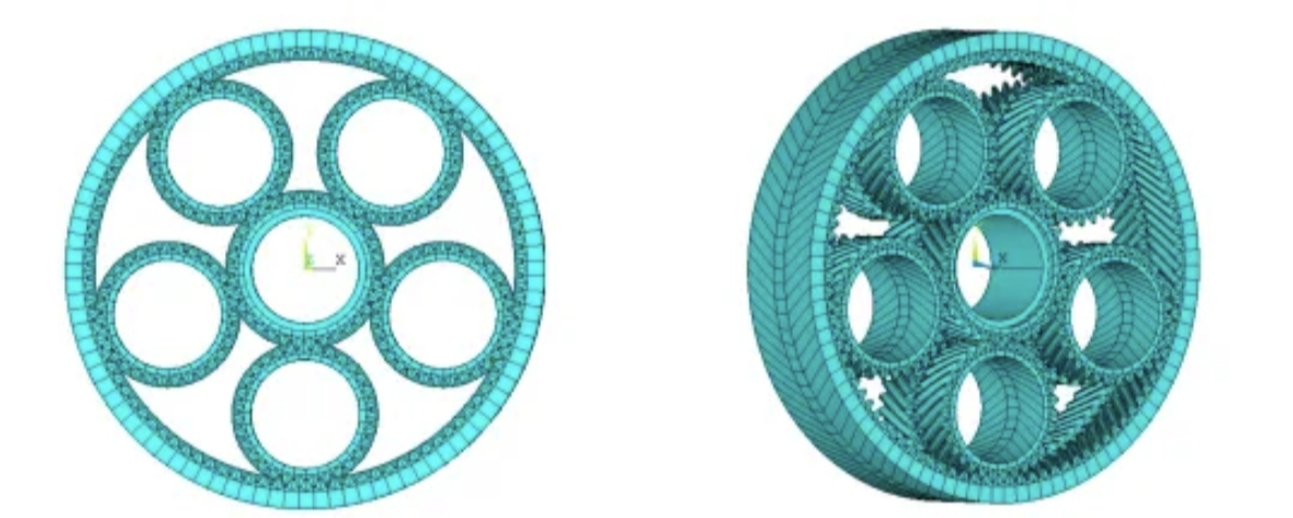 1.1 基于有限体积法仿真模型建立及热边界加载首先在 ANSYS 中建立行星人字齿轮系统的温度场分析模型,为实现在齿高方向上网格的均分,对每个齿进行切齿操作如图3.10为切分后的模型。