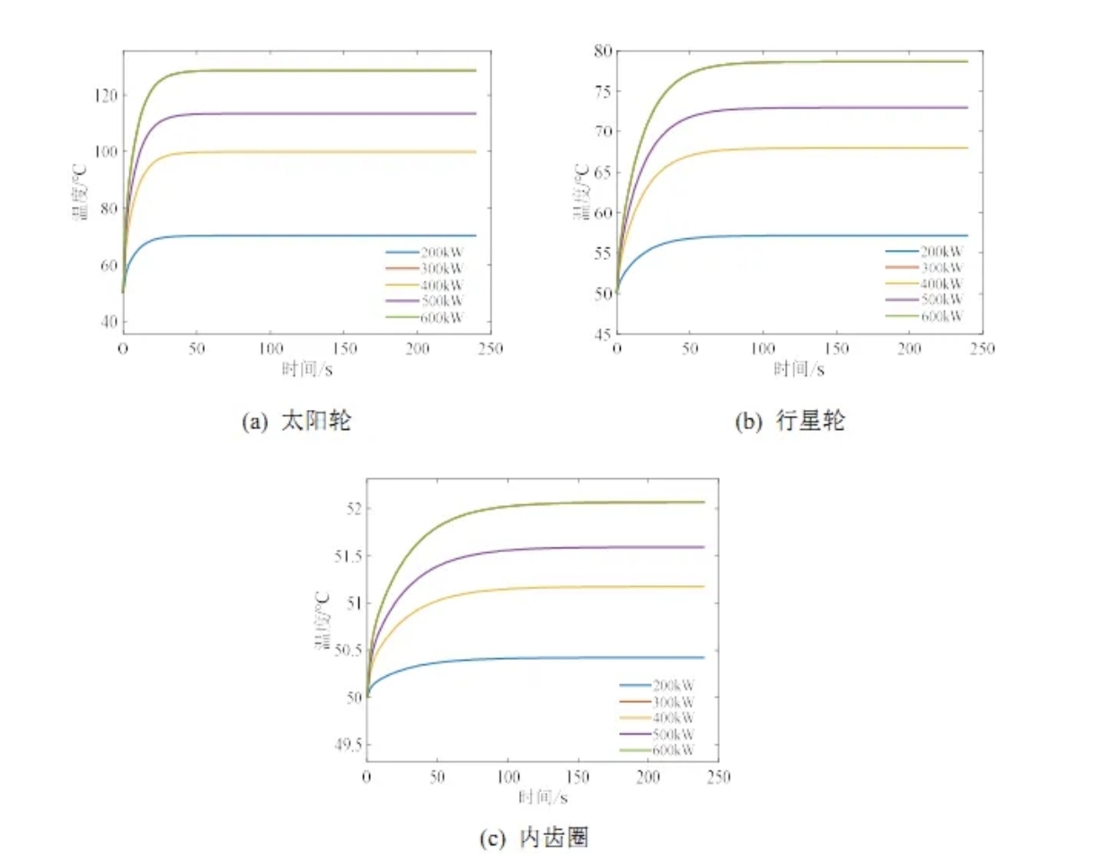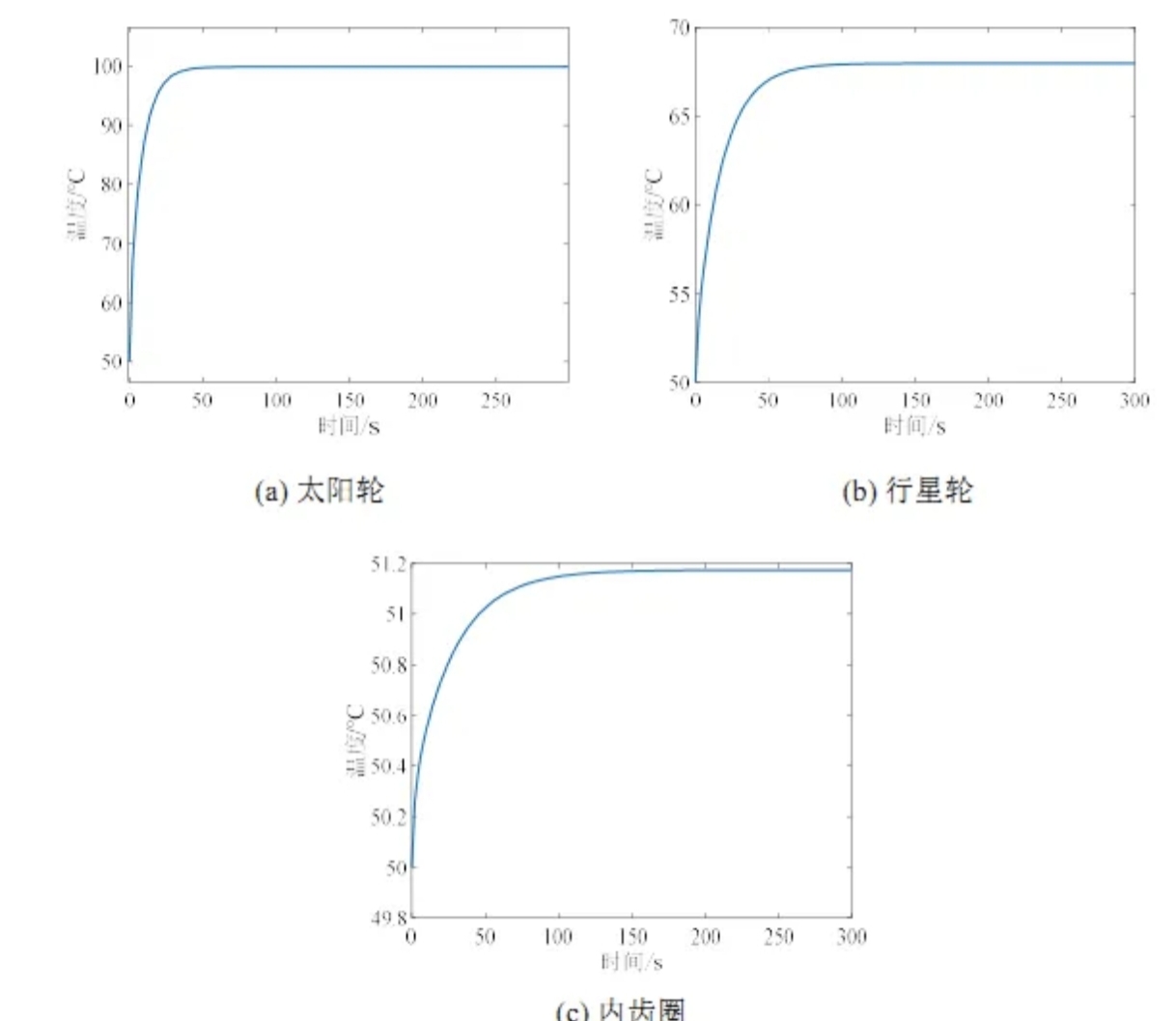 图下给出了太阳轮、行星轮和内齿圈的温度随时间的变化规律。