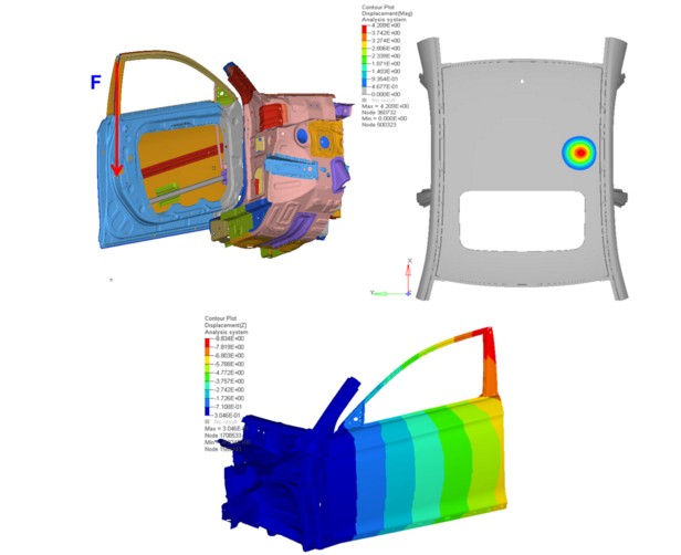 2. 扰动分析 可以获取结构在扰动载荷下的结构响应,研究结构在不平衡状态,或者在平衡状态附近的结构特性。扰动分析包括线性扰动分析,非线性变形结构 的正则模态和复特征值的提取,频率响应和模态法瞬态响应的计算。汽车刹车系统的啸叫分析是特殊的线性扰动分析的案例,它综合了接触约束,非对称摩擦力刚度,和复特征值的提取。