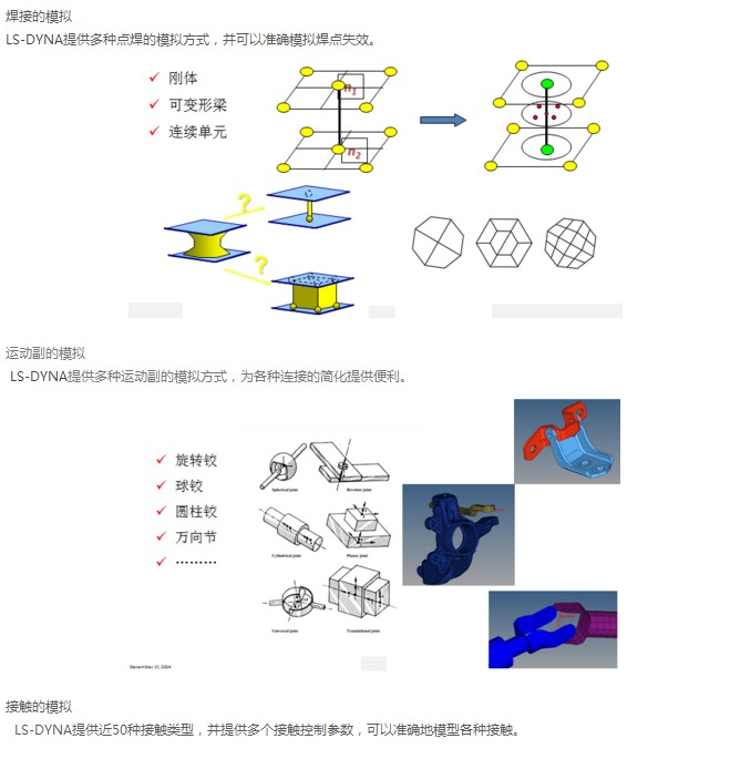 变形体-刚性体间、自身接触等接触类型,接触可以是考虑各种摩擦模型、粘连和分离等。具有丰富的单元库和非线性材料模型,分析类型可以是静力非线性、非线性屈曲和模态、动力非线性和蠕变分析及多种非线性的组