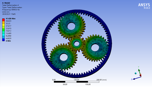 行星齿轮减速器具有体积小、结构紧凑、传动比大、效率高、轴承负荷小、可同轴传输运动和动力等优点,在很多情况下可代替定轴轮系传动机构,是机械工程领域广泛应用的传动类型。然而,齿轮传动过程中两轮齿间的啮合是线接触,啮合部位容易磨损,甚至造成齿轮轮齿折断,致使行星轮系传动失效,因此有必要对行星轮系进行静力学有限元分析,以改进行星轮系传动效率,减少齿轮传动过程中的振动和噪音,优化传动性能,提高使用寿命。同时,行星减速器在工作过程中,传动齿轮受到外部周期性载荷作用,在额定转速内有可能发生强烈的共振,动应力急剧增加,致使齿轮过早出现扭转疲劳和弯曲疲劳,最终引起轮齿折断。在行星轮系结构设计和计算中,静力学计算不能完全满足设计要求,因此有必要对行星轮系装配体进行模态分析,确定结构的振动特性,获得其固有频率、振型等参数。通过模态分析找出结构设计中的薄弱环节,避免行星轮系在外部载荷作用下产生共振,因此模态分析是行星轮系结构设计的重要内容,同时也是进行其他动力学分析前期必须完成的工作。
