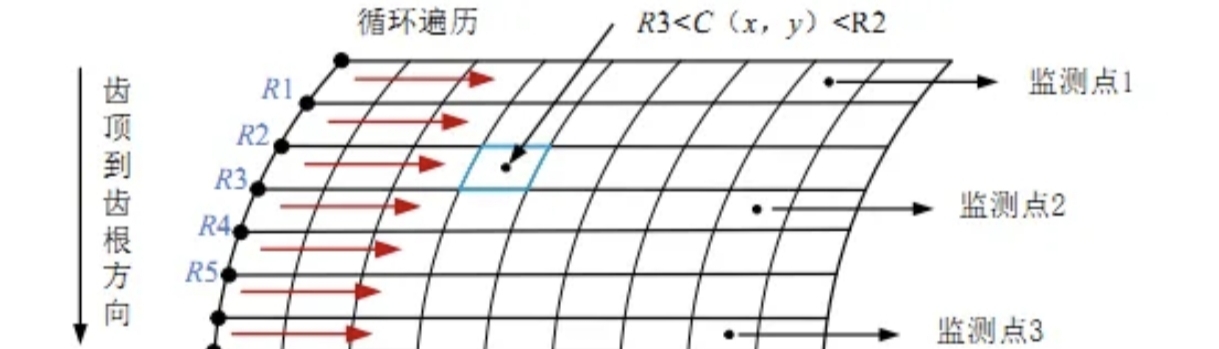 将 1.1 节中求得的单齿平均热流密度分布分别加载到齿轮沿齿高方向的各个位置。图 1.1 为加载原理图,在笛卡尔坐标系中,以齿面所在圆的半径差定义齿高方向网格划分加载区域,在 UDF 循环遍历网格时会自动求得网格位置的半径实现相应位置热流密度的施加。