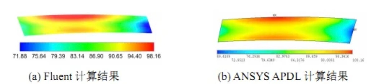 上图给出了两种方法得到的齿面温度分布,图中可以看到,两种方法得到的齿面的温度分布一致,由于内端面对流换热较大,因此最低温度出现在靠近内端面的齿面上,最高温度都出现在齿顶内侧,验证了Fluent计算的合理性。
