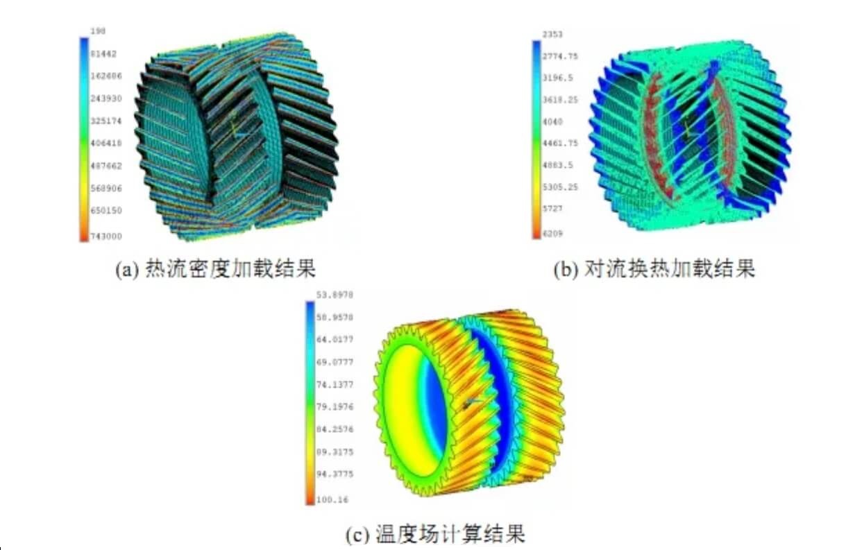 利用 ANSYS APDL 计算稳态温度场时,需要施加全齿面平均后的热流密度其值为单齿平均热流密度除齿数。在齿面添加热流密度及对流换热系数,其边界条件加载结果,求解得到其稳态温度场分布结果如图所示。